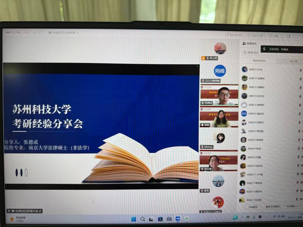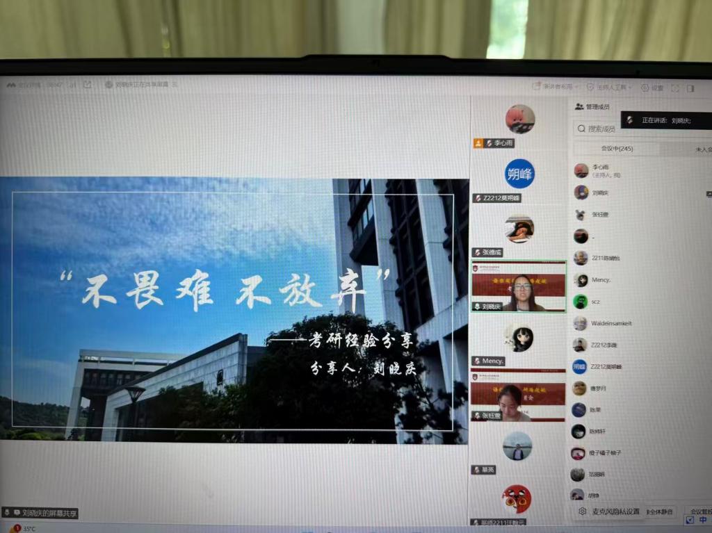 通过腾讯会议举办考研动员会暨经验分享会,旨在为学子明确备考方向、优化复习策略。学院党委副书记兼副院长周茹、辅导员李心雨主持会议,两百余名学子云端参与。