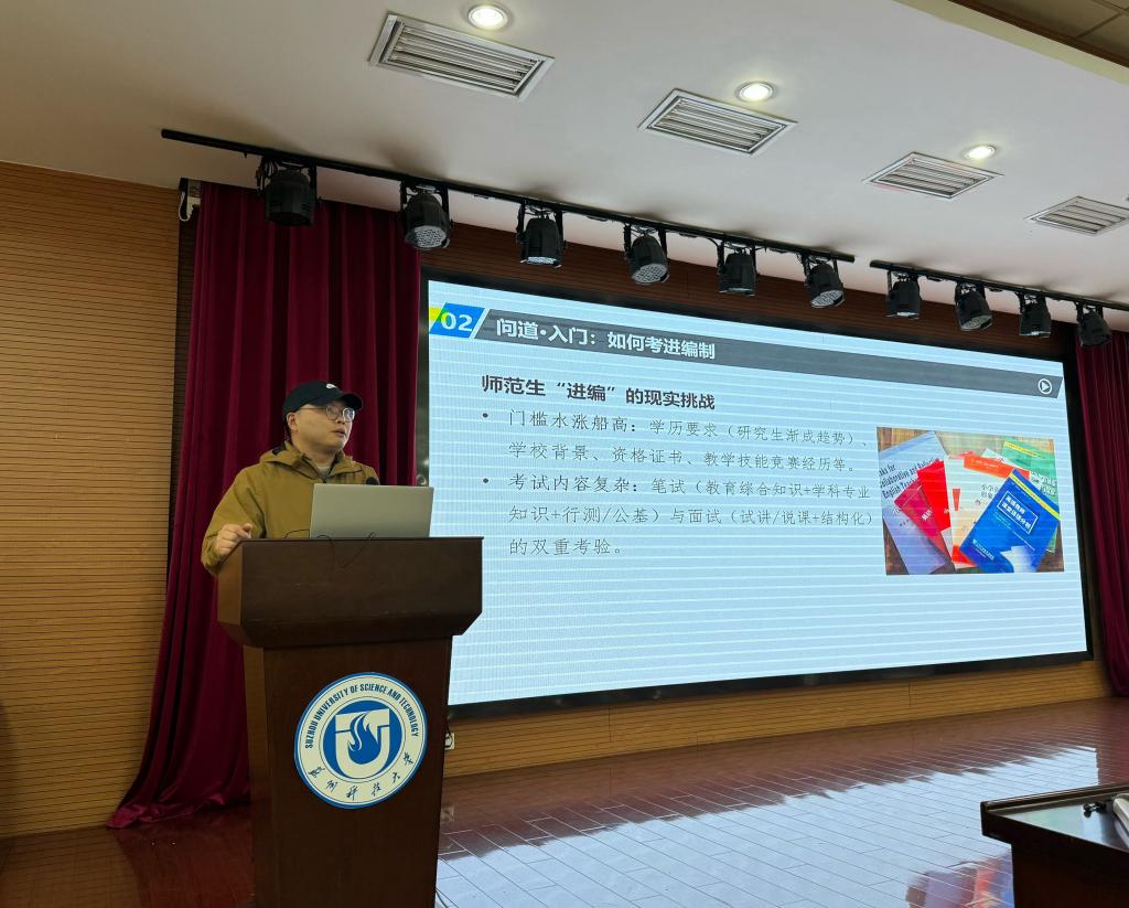 李老师从考编全流程拆解到备考策略精讲,从行业趋势解读到心态调节妙招,以亲身经历为蓝本,为即将踏上求职征程的学弟学妹们点亮了前行的灯塔。面对同学们普遍关心的师范专业发展前景问题,李老师结合当前教育政策与行业动态进行了深入分析。更以“过来人”的身份寄予希望学弟学妹以今日之所学为起点,锚定目标,脚踏实地,终将在心仪的讲台上绽放光彩。”