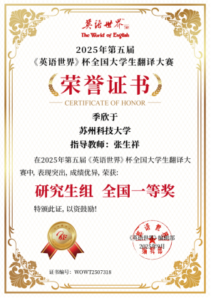 在2025年9月27日举办的第五届《英语世界》杯全国大学生翻译大赛中, 十大赌博平台网站2025级英语笔译专业研究生季欣于荣获一等奖,指导教师为张生祥教授。