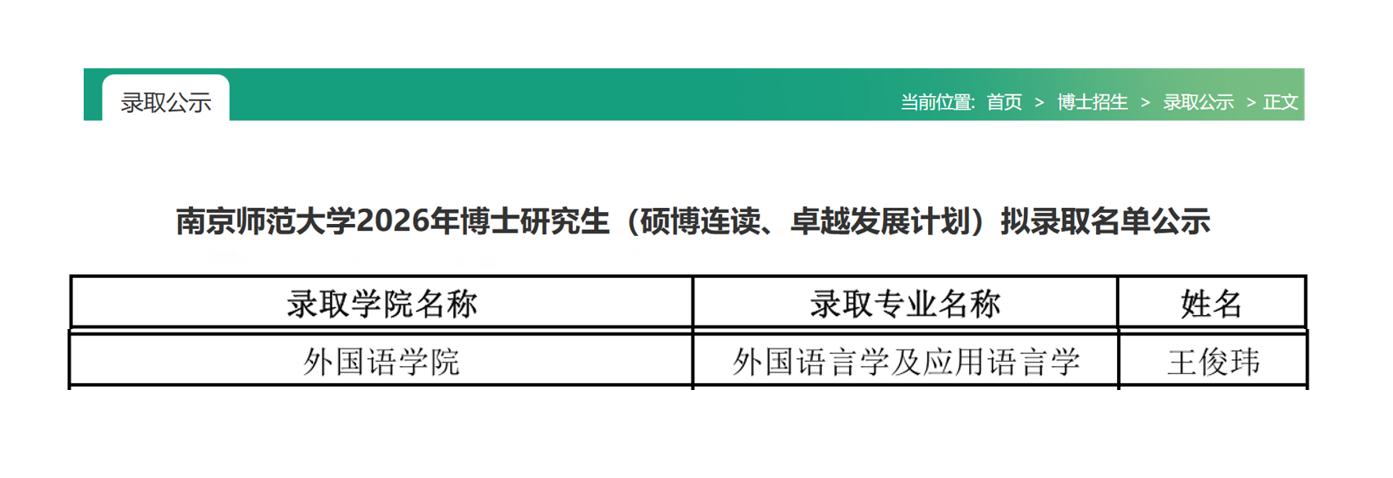 近日,南京师范大学公布博士研究生录取结果,十大赌博平台网站2023级学科教学(英语)专业硕士研究生王俊玮被该校外国语言学及应用语言学专业(卓越发展计划)录取。该成果既是王俊玮同学个人学业精进的重要突破,也彰显了十大赌博平台网站在研究生教育领域的扎实功底与显著成效。